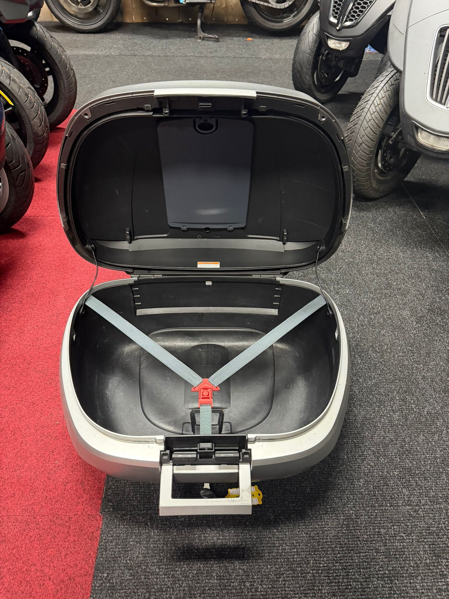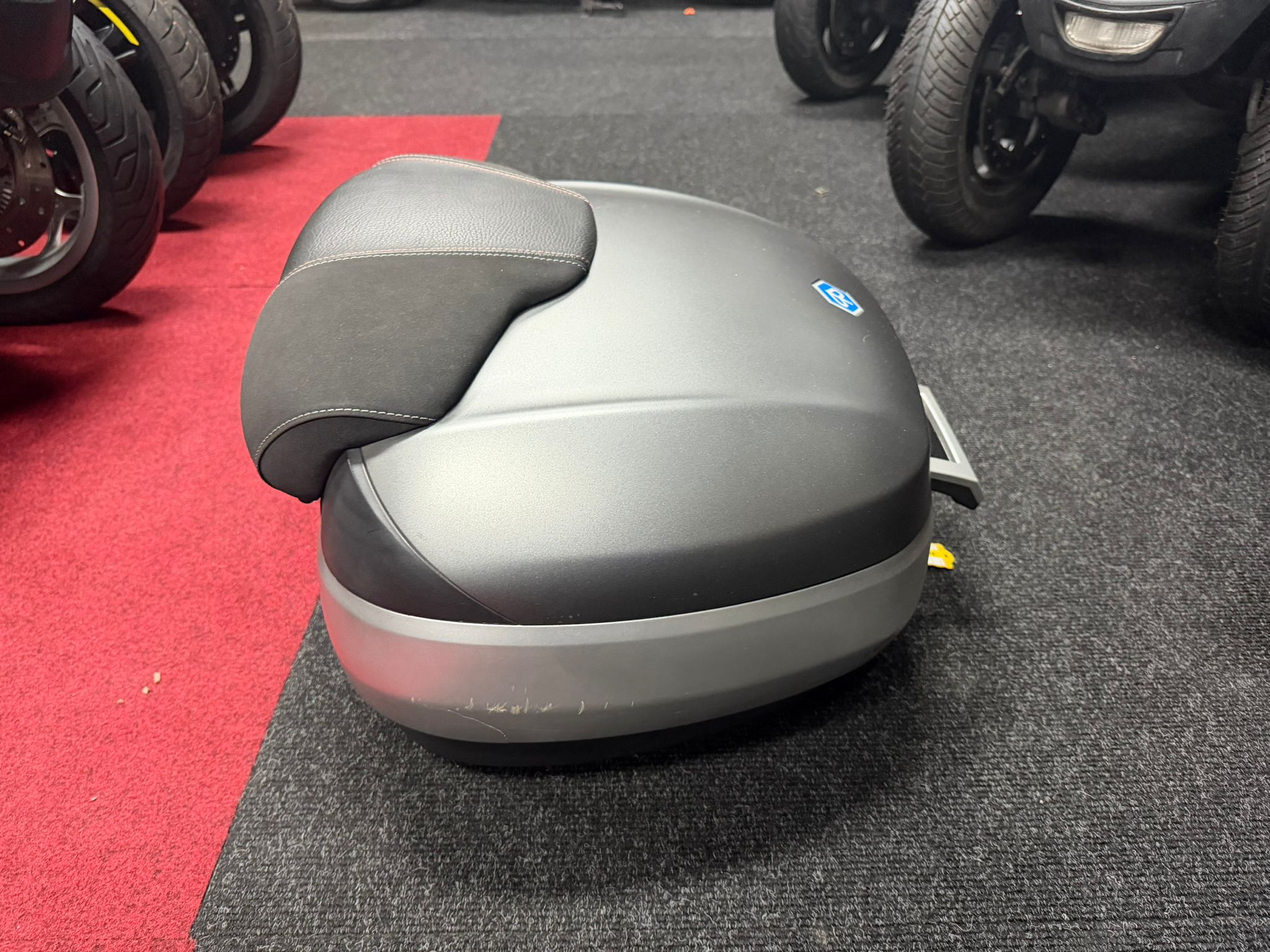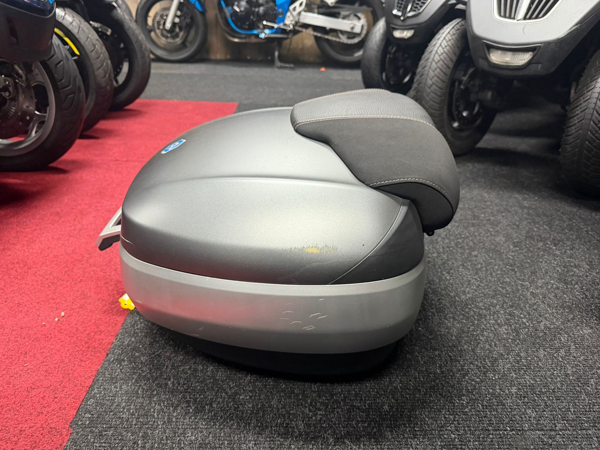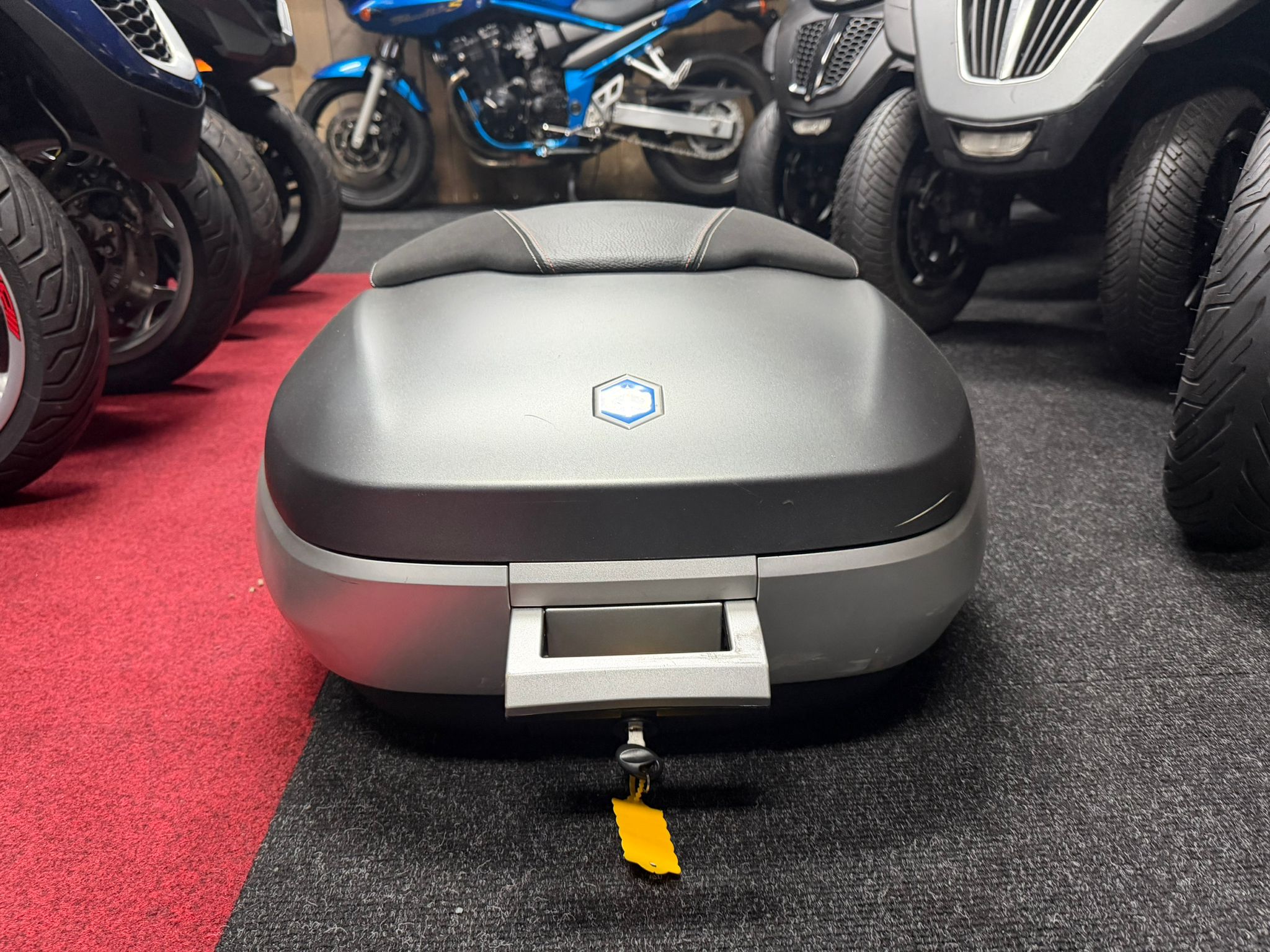 De koffer wordt geleverd inclusief originele Piaggio topkofferdrager, waardoor montage eenvoudig en volledig plug & play is op alle Piaggio MP3-modellen. De mat grijze afwerking sluit perfect aan op de MP3-modellen met grijze accenten of een metallic/matte lak.